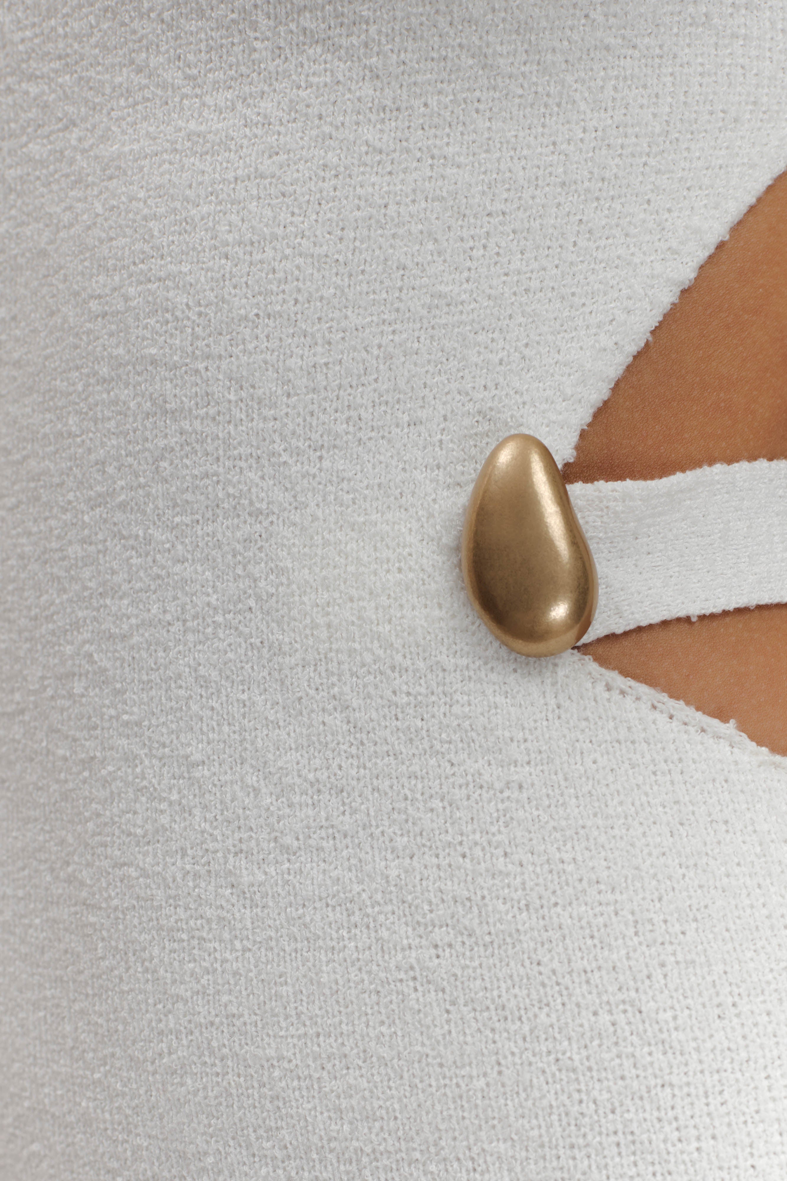 Introducing the ALYSANNE Cut Out Knit Maxi Dress, a stunning blend of elegance and modern design. This dress features a striking square neckline that beautifully frames the collarbone, while the back cutout adds a bold yet sophisticated detail. A secure back waist strap enhances your silhouette, complemented by a charming button detail at the waist that elevates the overall look. The centre back leg split introduces a hint of allure, while the straight skirt shape maintains a timeless appeal. Unlined for a lightweight feel, this dress is versatile enough for any occasion, from daytime events to evening gatherings.Â