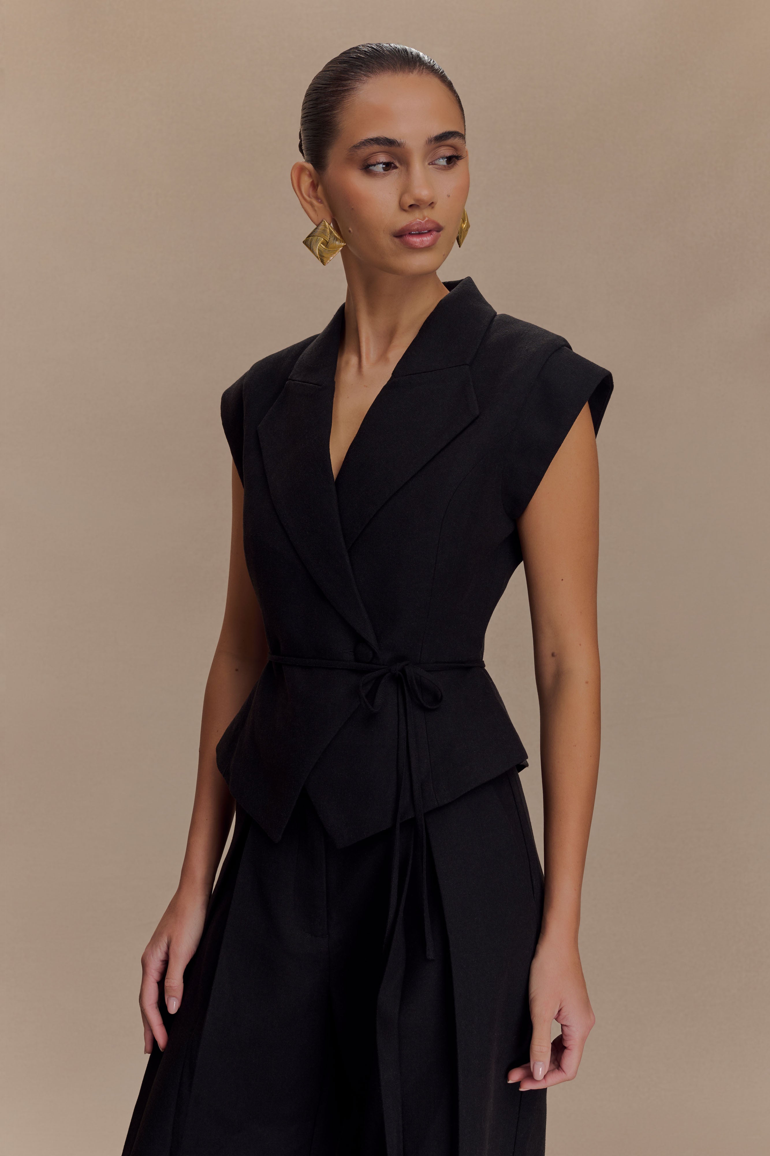 Make a statement in the ANDINA Short Sleeve Linen Top, where modern tailoring meets soft femininity. Designed with an asymmetric lapel neckline and wrap-fitted silhouette, this piece artfully frames the body while the back waist tie cinches for a flattering shape. The cap short sleeves add a polished touch, balanced by a refined button closure and full lining for all-day comfort. Whether dressed up or pared back with the Raya Mid Rise Wide Leg Linen Pant, this top delivers contemporary style with timeless appeal.