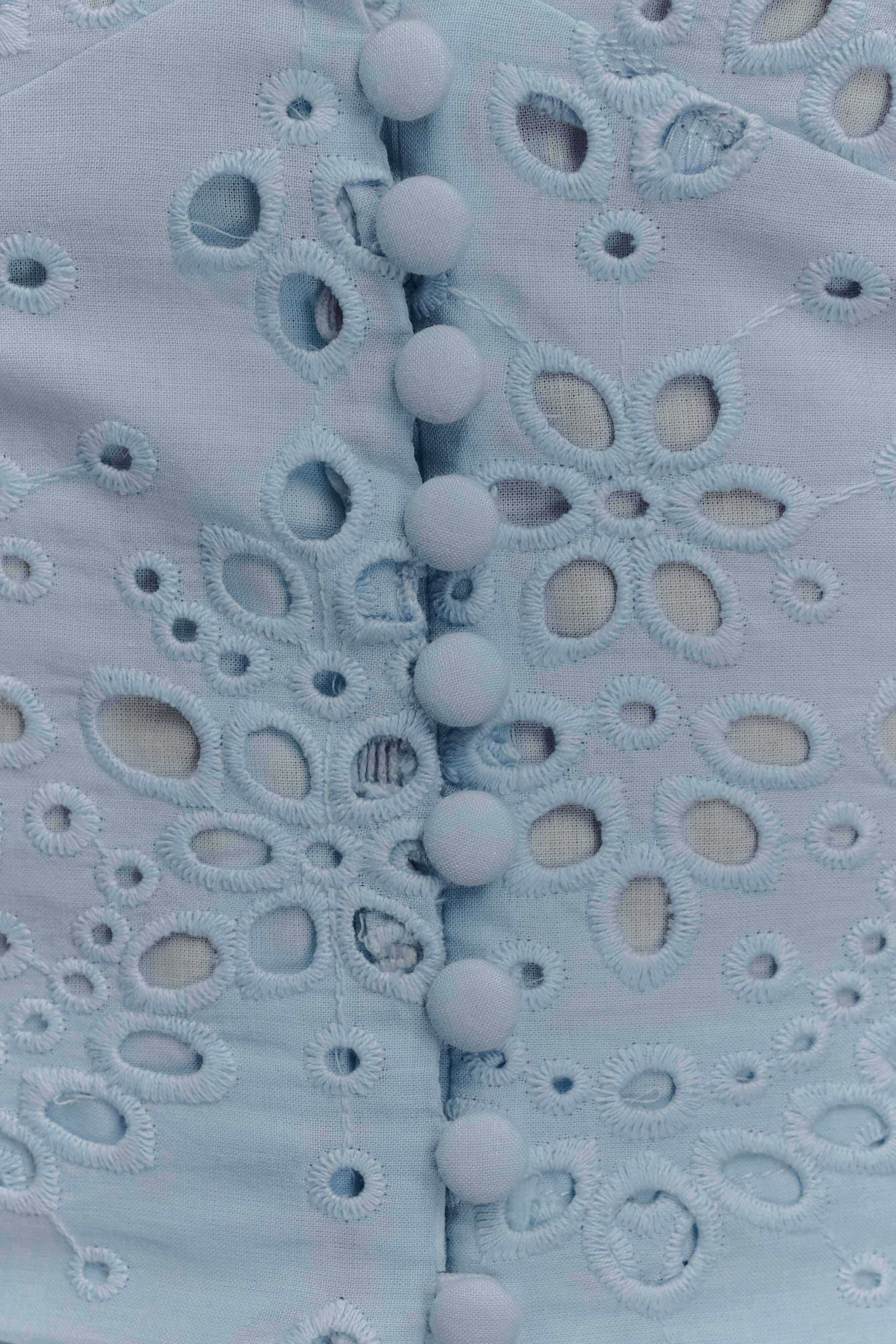 The ARLA Sleeveless Broderie Top is a fresh take on effortless femininity. Designed with a delicate V-neckline featuring a scalloped edge, this cropped silhouette flatters with an underbust seam and front and back shaping seams for a contoured fit. The button-front opening adds a classic touch, while the intricate broderie fabrication enhances its romantic appeal. Fully lined for comfort, this top pairs beautifully with the Arla Broderie Midi Skirt for a coordinated look that exudes elegance and modern charm.