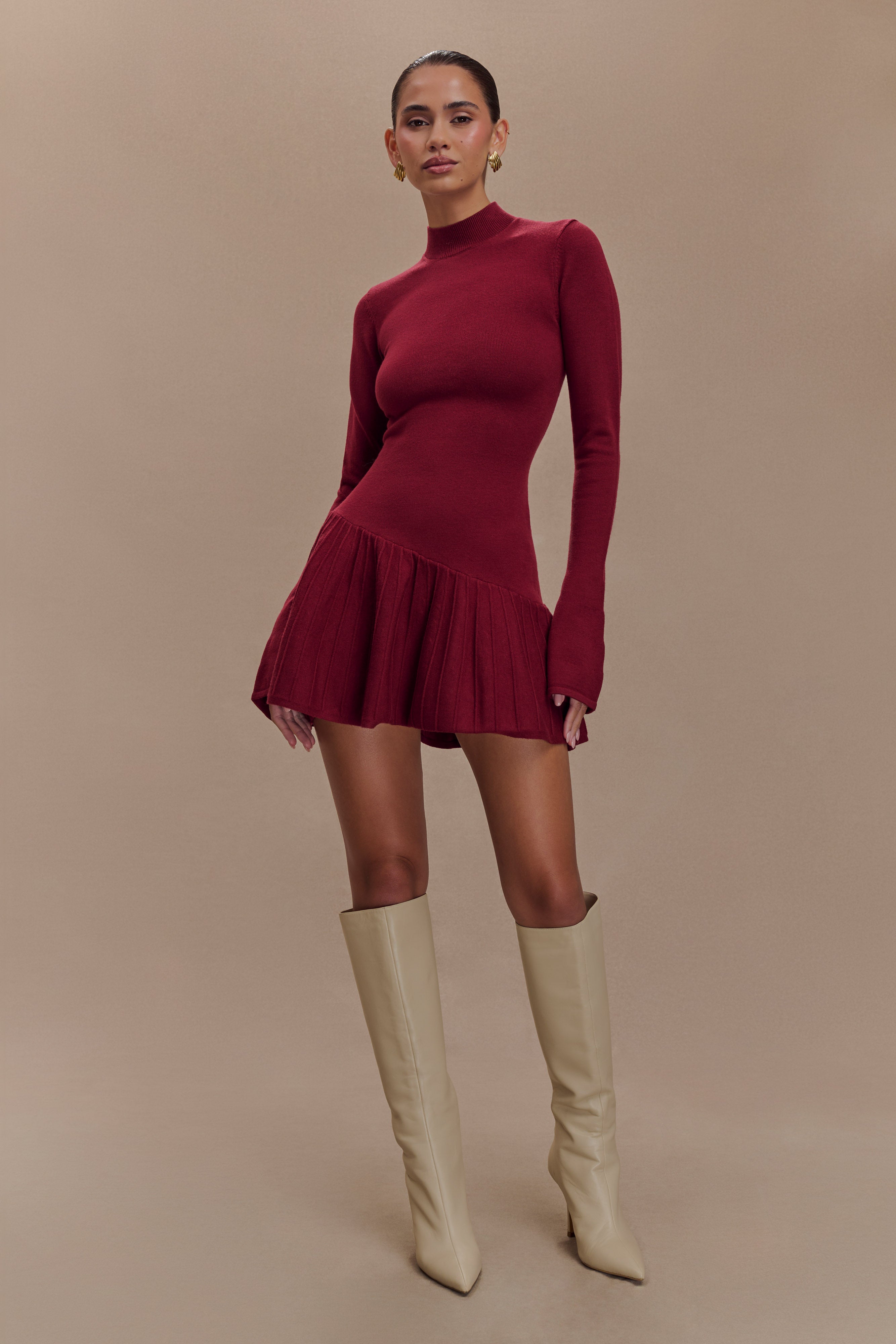 Introducing the BLAIR Knit Mini Dress with Pleats, a perfect blend of contemporary style and effortless elegance. This dress features a chic high neckline and long sleeves, ideal for transitional weather. The asymmetrical skirt panel seam adds a modern touch, while the pleated lower skirt creates beautiful movement. Flared sleeve hems enhance the unique silhouette, making this dress a standout choice. With its playful mini length, it pairs beautifully with your favourite ankle boots or heels, making it perfect for both day and evening wear.Â