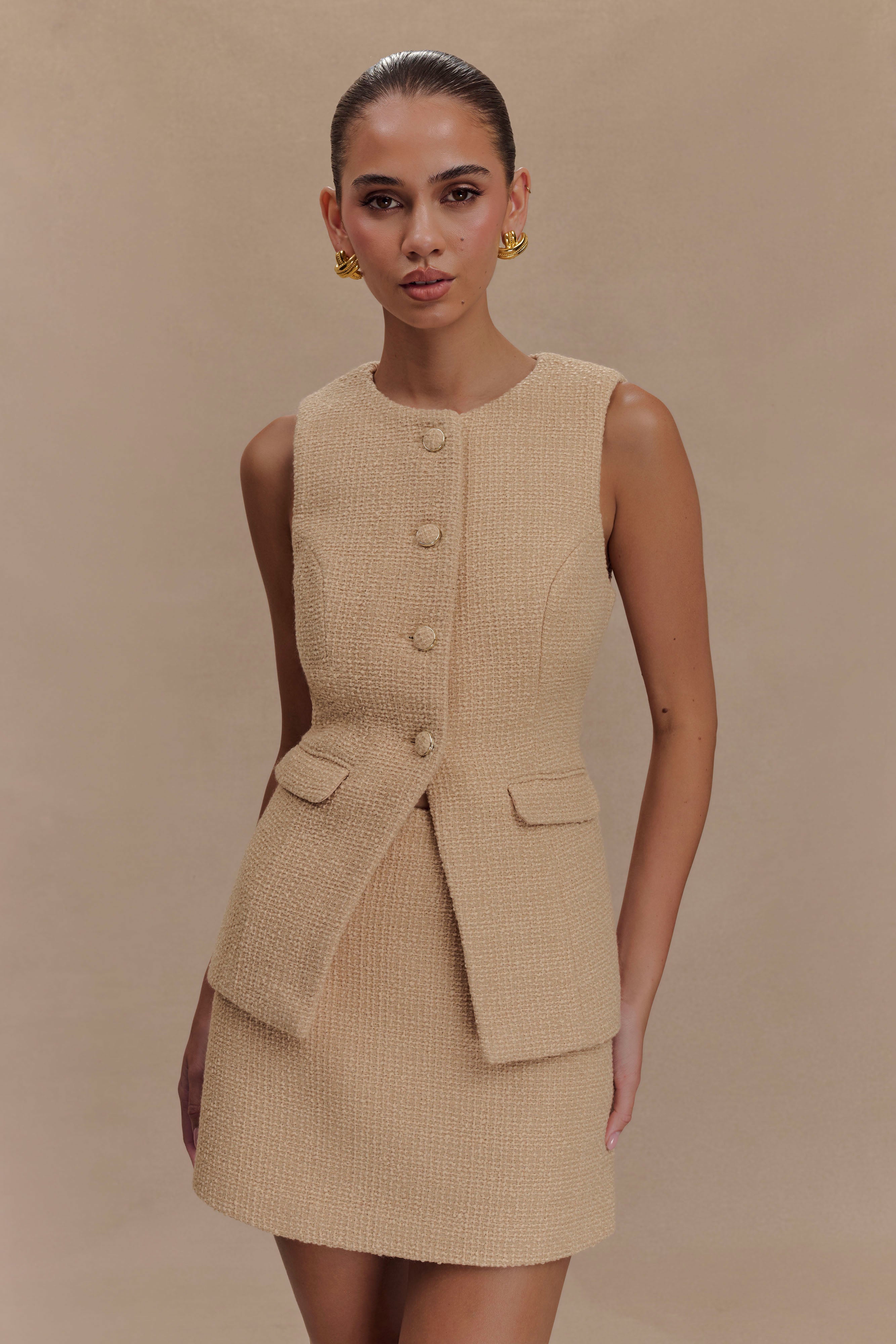 The CAMILLA Boucle Mini A-Line Skirt is a chic and versatile wardrobe staple that effortlessly combines style and sophistication. Featuring a high-waisted fit and flattering A-line shape, this skirt is made from textured boucle fabrication for a luxurious touch. The mini length and side zip closure create a sleek and streamlined silhouette, while the fully lined interior ensures comfort. Pair it with the Camilla Boucle Sleeveless Vest for a coordinated, polished look that’s perfect for both casual outings and more elevated occasions.