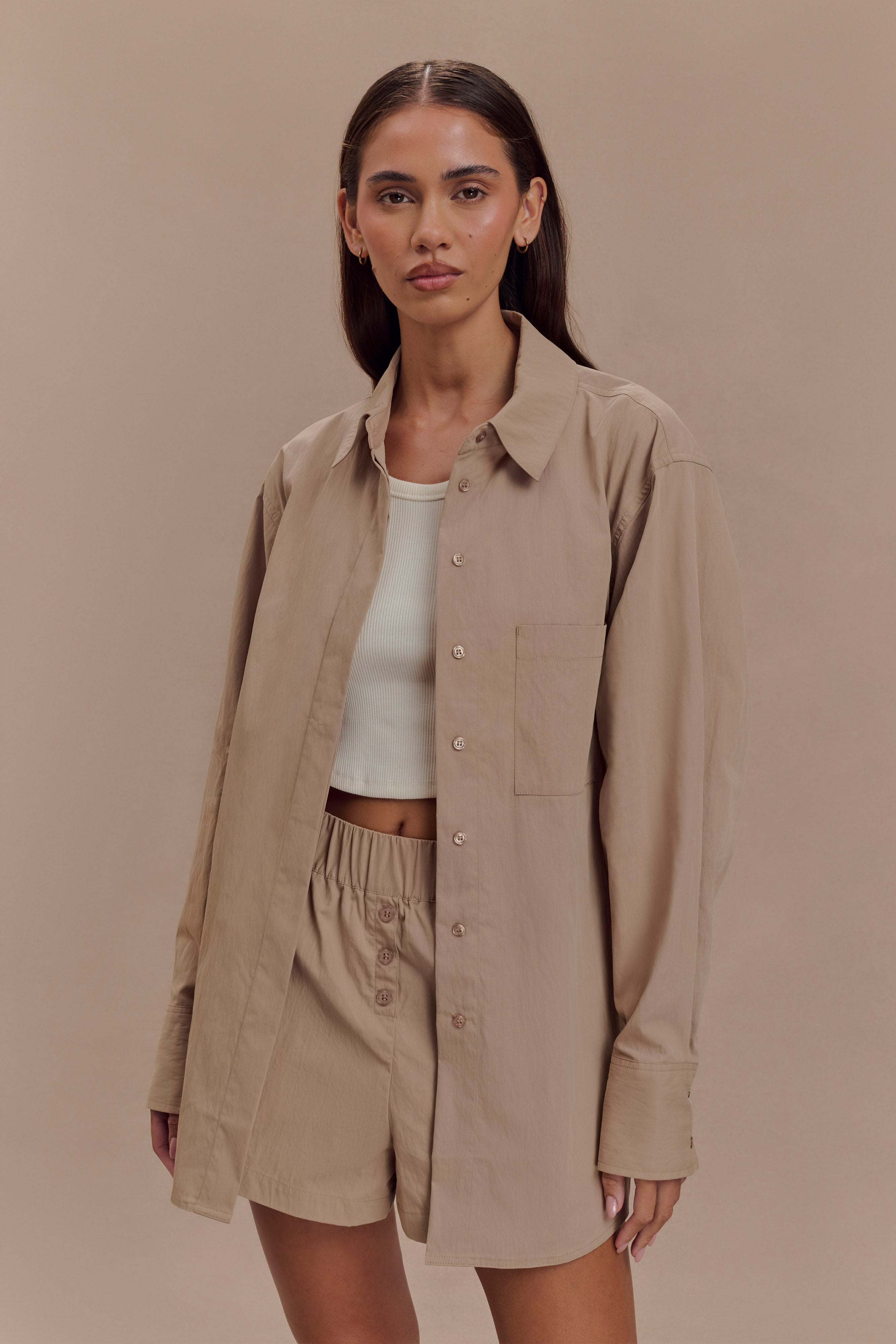 The CAMPBELL Cotton Oversized Shirt combines effortless style with everyday comfort. Featuring a classic collared neckline and button-front closure, this shirt exudes a relaxed yet refined vibe. The oversized fit offers a breezy, laid-back silhouette, while the long sleeves with button-up cuffs add a touch of structure. The rounded hem shape adds a modern twist, making it easy to wear tucked in or left loose. Perfect for casual days or dressing up with ease, pair this shirt with the Johanna Cotton Relaxed Shorts for a chic, coordinated look that blends comfort and style seamlessly.