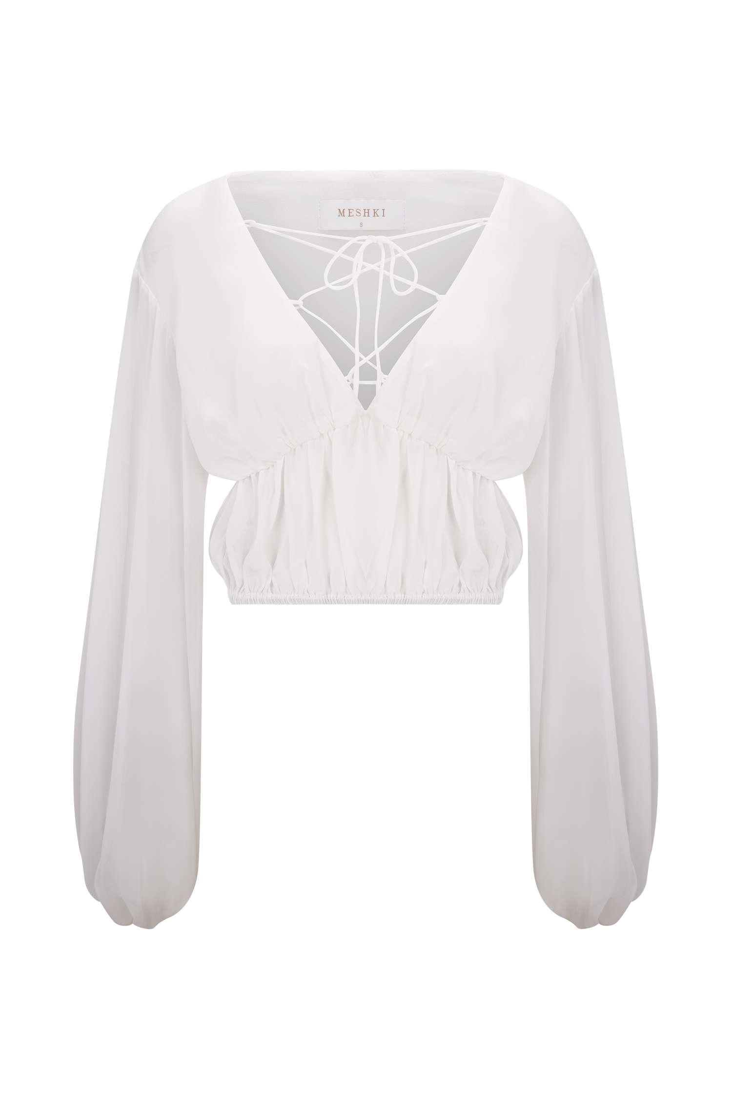 The CARLIE Chiffon Cross Tie Top brings a breezy sophistication to your wardrobe staples. Designed with delicate criss-cross rouleau ties and a flattering cropped silhouette, it features a softly lined bust, long sheer sleeves, and an elasticated waist hem for a comfortable fit. Its relaxed shape and fluid chiffon fabrication make it perfect for pairing with skirts, tailored pants, or your favourite denim for an effortlessly styled moment.