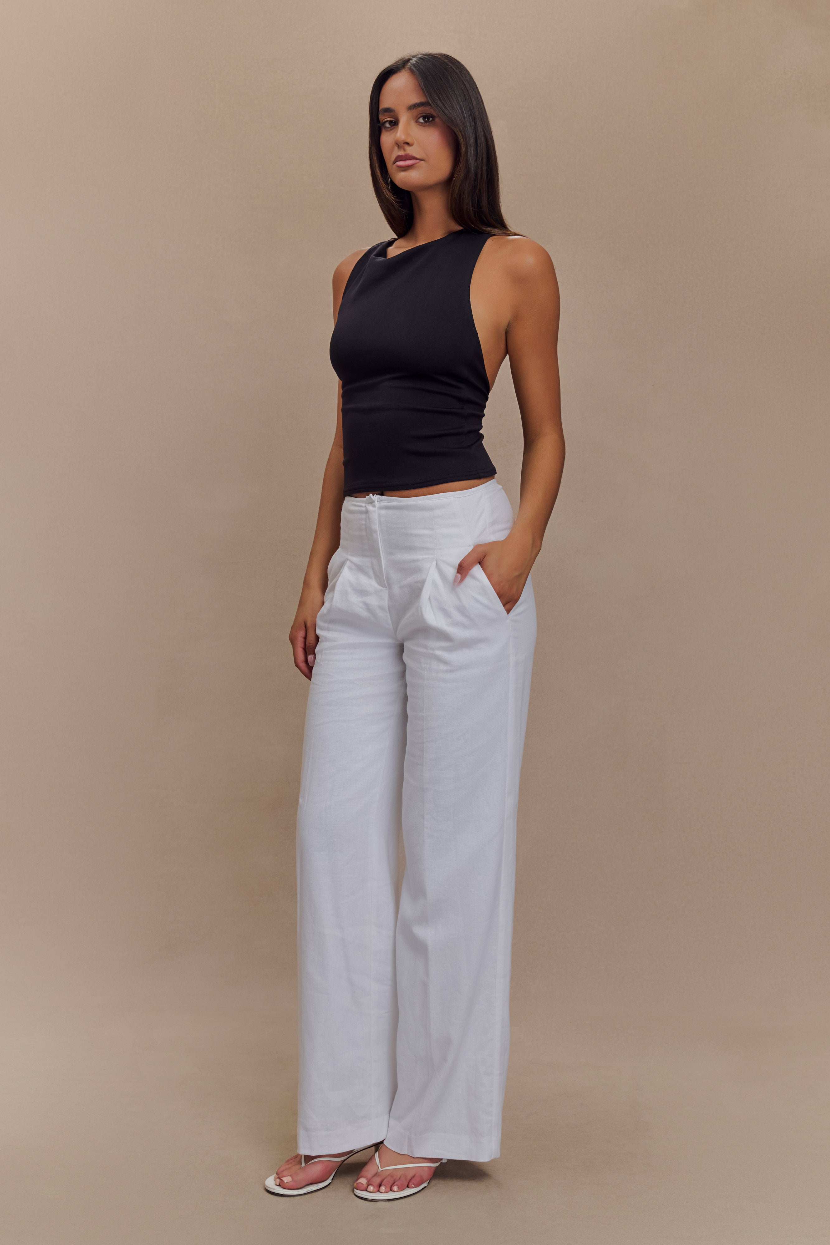 The CATELYN Asymmetrical Scuba Jersey Top is the perfect blend of modern sophistication and sleek style. Featuring a sleeveless design with a flattering round neckline, this top offers a fitted, body-hugging silhouette for a polished, confident look. The back ruched sash detail adds a touch of drama and dimension, while the open back creates a bold, eye-catching finish. Fully lined for comfort, this top effortlessly elevates any ensemble, making it ideal for both casual and dressy occasions