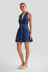 Behold the EUGENIE Collared Denim Mini Dress, a timeless expression of casual elegance. This dress combines classic elements with contemporary flair, featuring a collared neckline and a flattering V neckline that exudes sophistication. The CENTRE front button closure adds a refined touch, while the sleeveless design ensures comfort on warm days. With princess panel seams and an A-line skirt shape, this dress offers a flattering silhouette that enhances your curves. The fitted bodice provides structure and definition, while the mini length adds a playful and youthful vibe. Whether you're dressing up for a night out or keeping it casual for a day in the city, the Eugenie is sure to elevate your style with its versatile and chic design.
