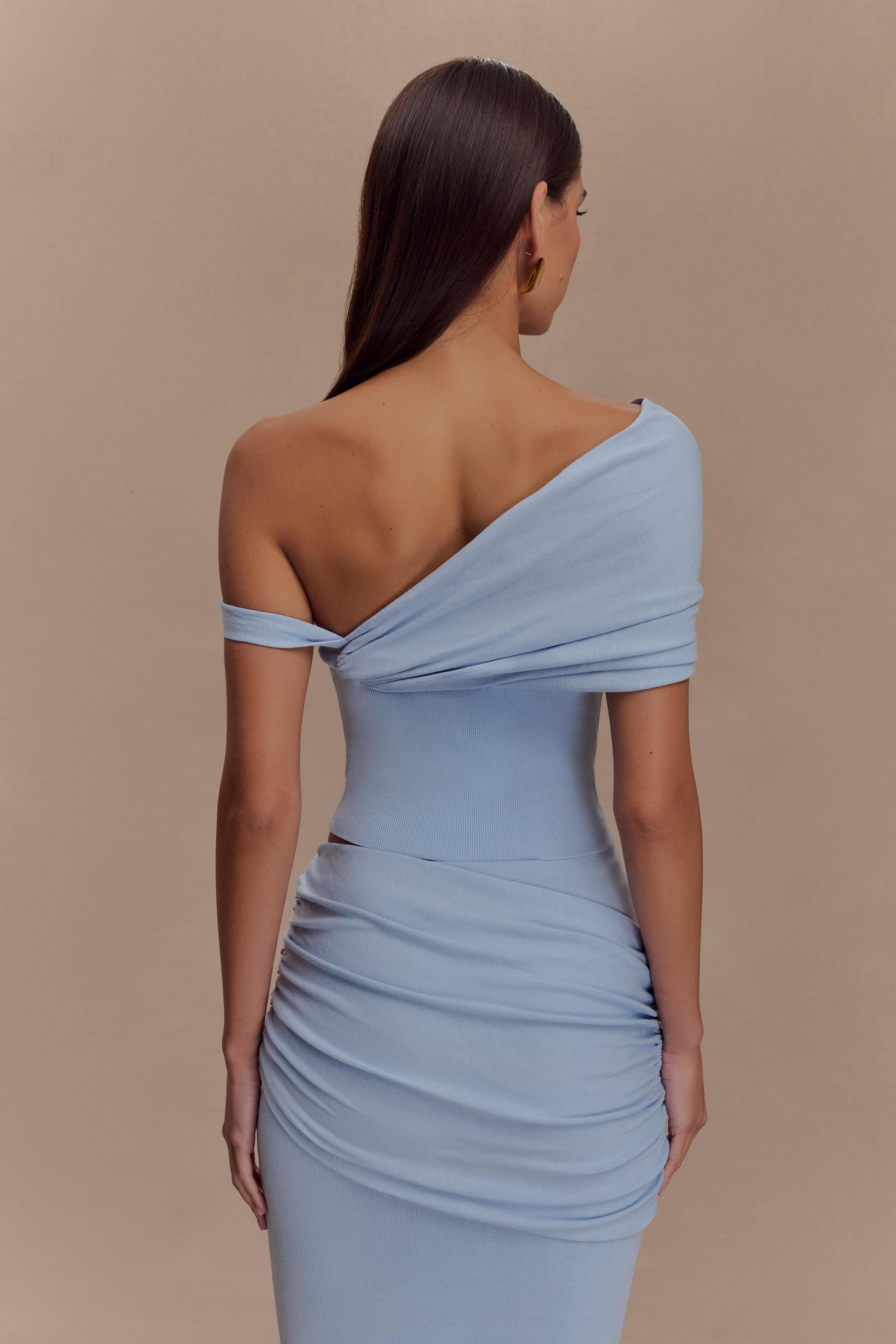 The IRENE Gathered Knit Top is a modern take on effortless elegance. Designed with an asymmetrical silhouette and off-the-shoulder Bardot sleeves, this bodycon fit contours the frame with soft, flattering gathers. The pull-on design ensures ease of wear, while the unlined knit fabrication keeps it lightweight and breathable. Perfectly paired with the Irene Gathered Knit Maxi Skirt, this coordinated set creates a sophisticated yet effortless statement for any occasion.