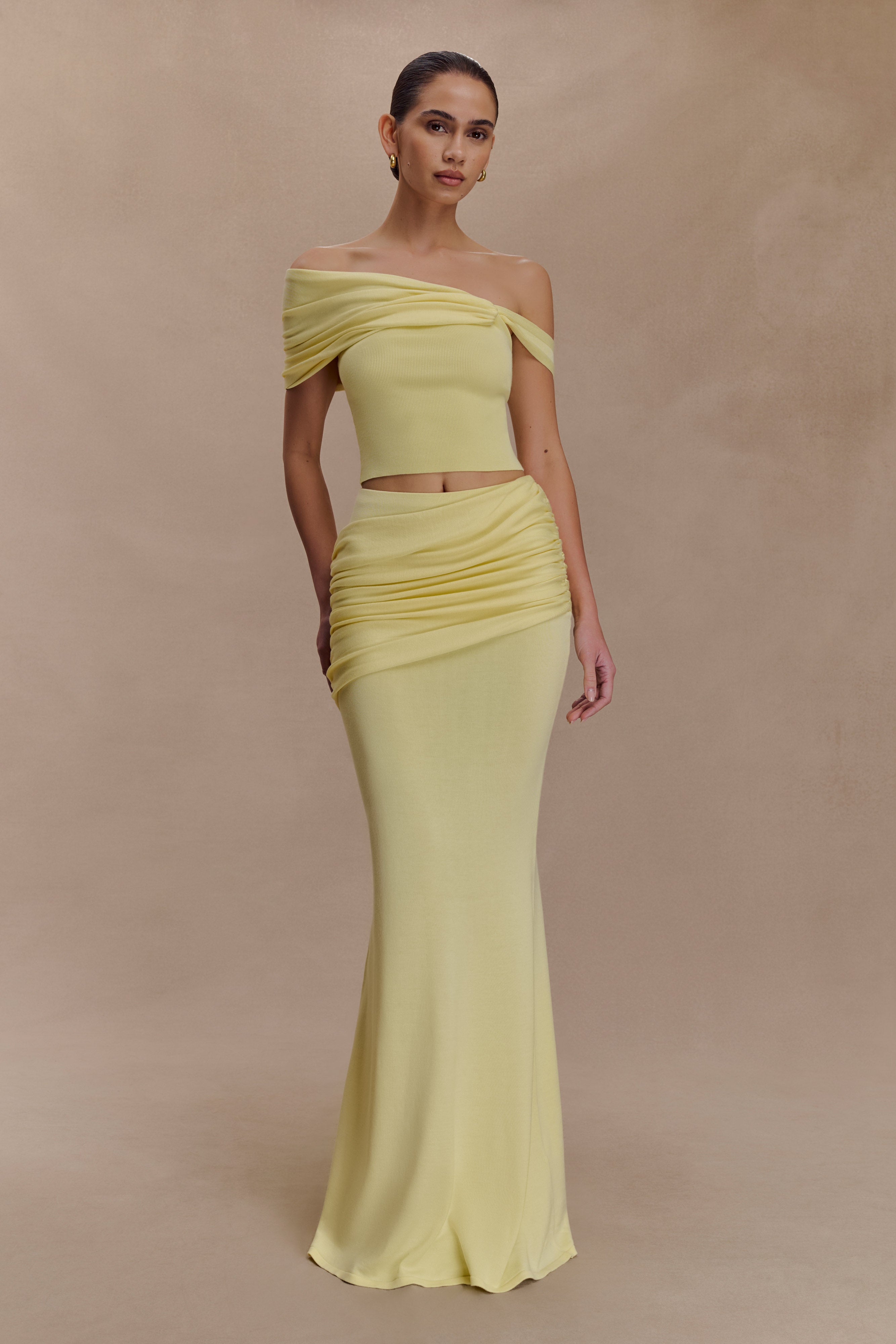 The IRENE Gathered Knit Top is a modern take on effortless elegance. Designed with an asymmetrical silhouette and off-the-shoulder Bardot sleeves, this bodycon fit contours the frame with soft, flattering gathers. The pull-on design ensures ease of wear, while the unlined knit fabrication keeps it lightweight and breathable. Perfectly paired with the Irene Gathered Knit Maxi Skirt, this coordinated set creates a sophisticated yet effortless statement for any occasion.