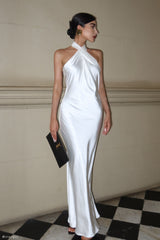 The LAURA is a beautiful satin gown with a twisted halter neckline, low, scooped back, and draped, flowing hem. A sleeveless design paired with a halter twist neckline emphasizes and flatters the shoulders. Crafted with a bias cut, this gown allows for enhanced flexibility and a flattering drape that moves effortlessly with your body. The back features a modestly low scooped neckline that flows into an invisible side seam zipper and fabric-covered buttons. This dress will have you feeling powerful and desirable no matter what.