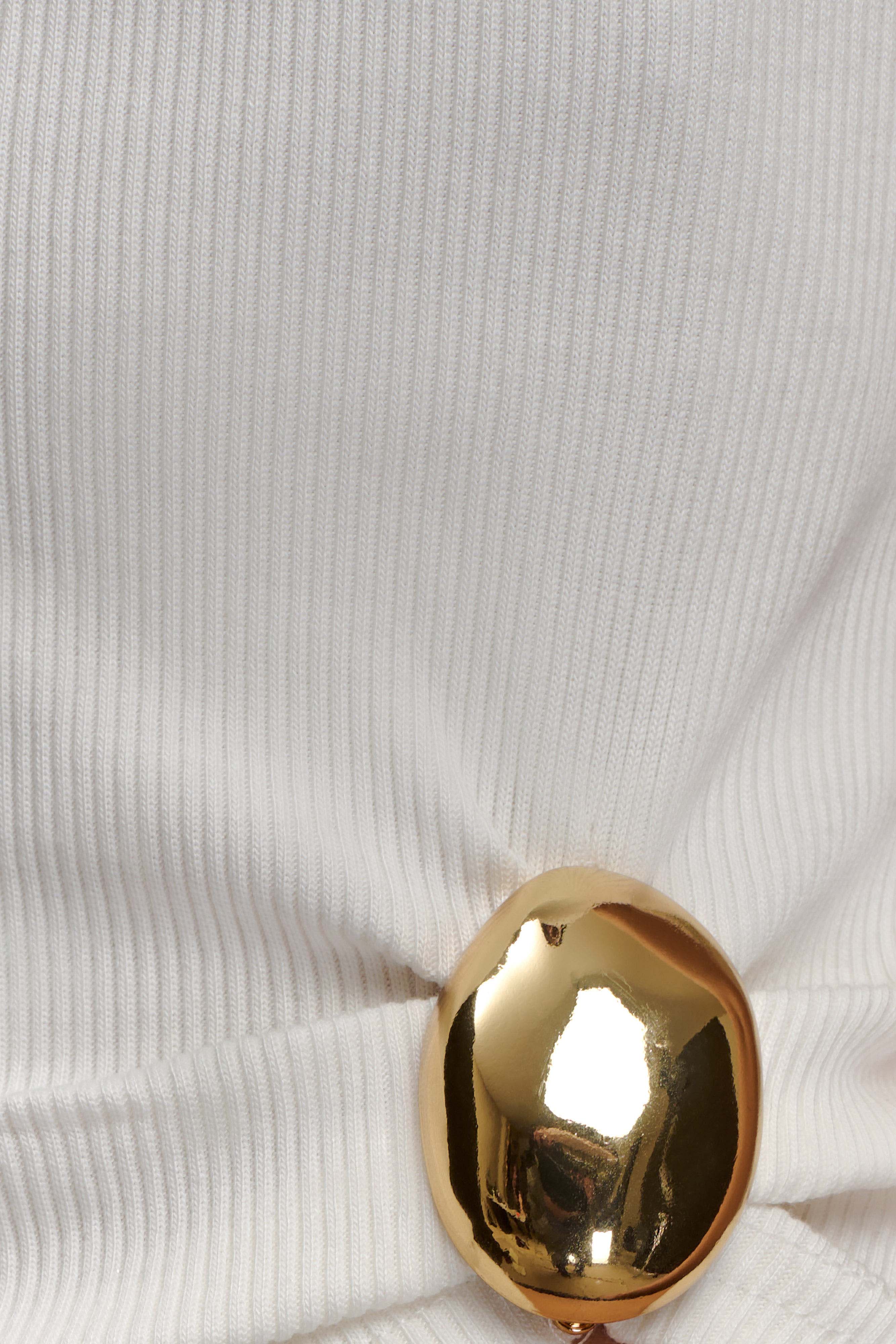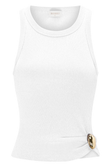 The LOLA Ribbed Sleeveless Top With Hardware is a minimalist staple elevated by directional accents. Designed with a crew neckline and racer-back cut, it frames the shoulders with clean lines. A ruched side detail secured with statement hardware creates subtle dimension, while the fitted bodice sculpts the silhouette. Crafted from ribbed fabrication and left unlined for ease, this top blends versatility with contemporary polish—perfect styled with denim or tailoring.