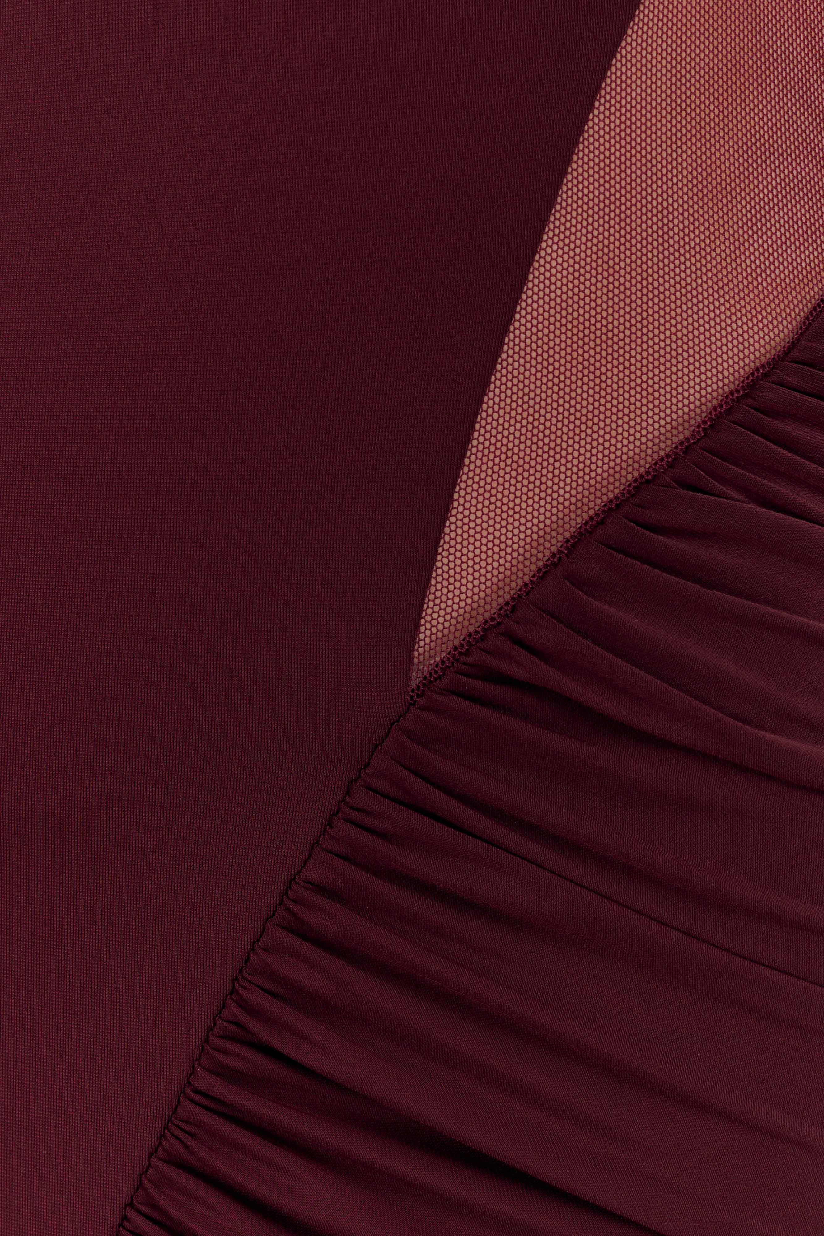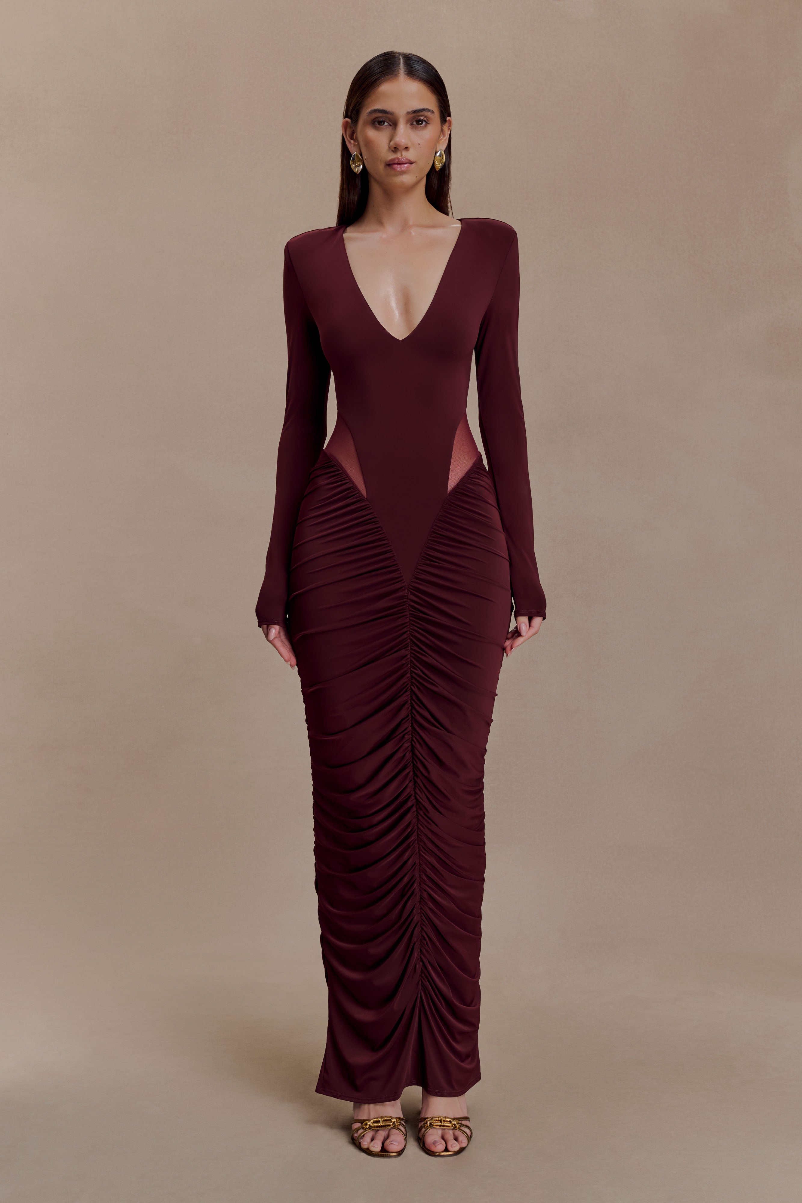 The LOUANNE Slinky Long Sleeve Maxi Dress is a striking silhouette designed with directional detail. A plunging V neckline is balanced by long sleeves, while a centre cut-out adds bold allure. Gathered accents shape the skirt, enhancing the fitted bodycon design with fluid dimension. Complete with detachable shoulder pads for a structured option, and cut to a maxi length, this dress blends versatility with after-dark sophistication.
