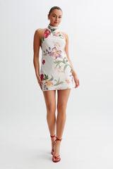 The LYNELLE High Neck Mini Dress is a captivating blend of elegance and allure. Featuring a halter neckline that frames the shoulders beautifully, it exudes sophistication. The front cowl detail adds a touch of glamour and drapes gracefully, while the button closure adds a hint of vintage charm. With a low scoop back that adds a flirty touch, this dress strikes the perfect balance between chic and sensual. Crafted with a bias cut for a flattering silhouette, and adorned with a printed design for added flair, it's perfect for making a statement at any event. Whether you're hitting the town or attending a special occasion, the Lynelle Mini Dress promises to turn heads with its undeniable charm and modern style.