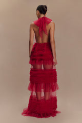 The MINKA Mesh Ruffle Halter Maxi Dress is a captivating blend of boldness and romance. Featuring a daring deep plunge neckline and an adjustable halter for a perfect fit, this dress is designed to turn heads. The gathered mesh bust panels create soft texture and flattering detail, while the tiered ruffle mesh skirt adds a flowing, ethereal charm. With its maxi length, it offers a dramatic silhouette, and the unlined design ensures a light, airy feel.