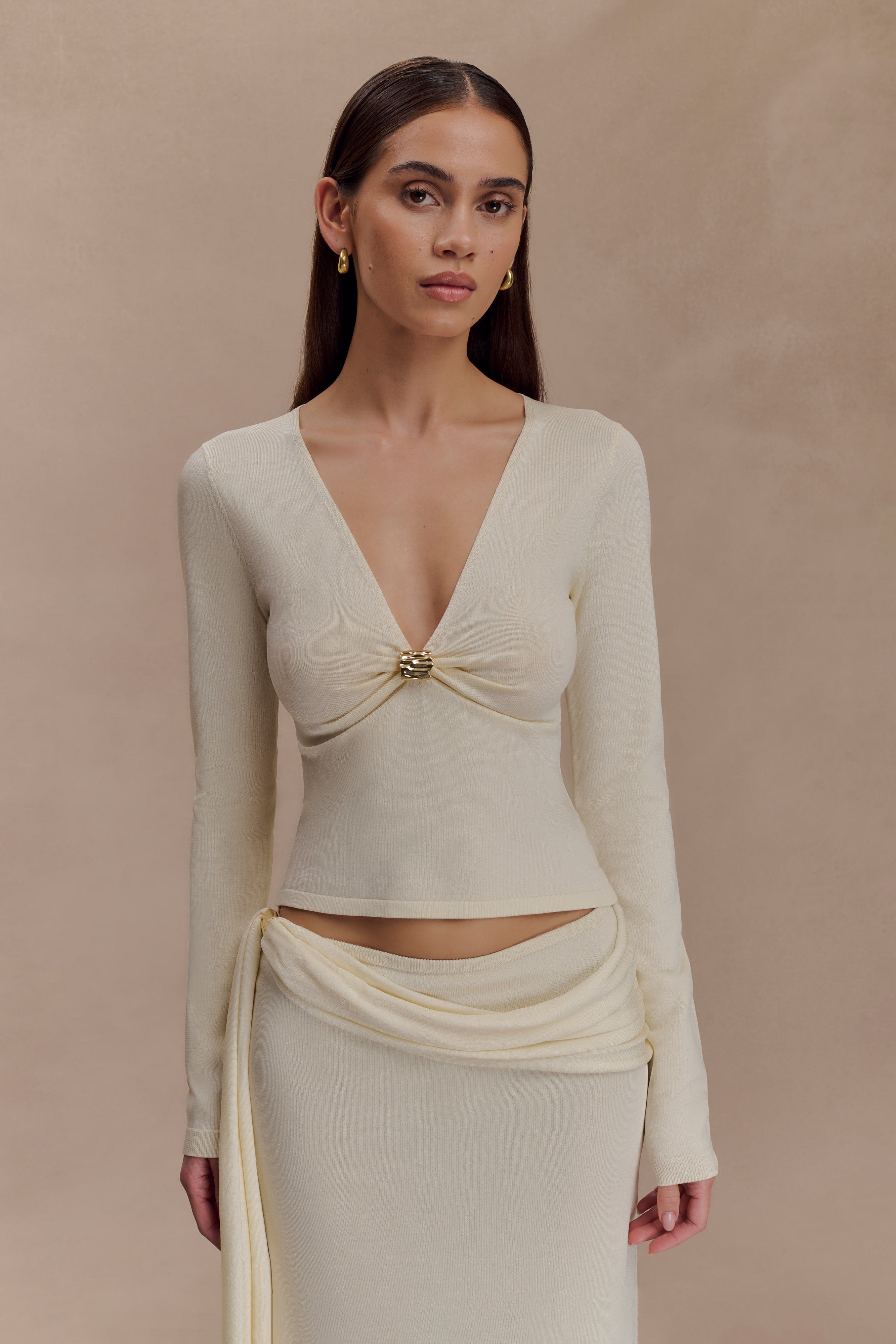 The MIRABY Front Ruched Knit Long Sleeve Top is a fitted essential with a contemporary edge. Designed with a flattering V neckline, it features a front hardware accent framed by soft ruching for a sculpted effect. Long sleeves balance the streamlined silhouette, while the unlined knit fabrication keeps this top lightweight and versatile for year-round wear.