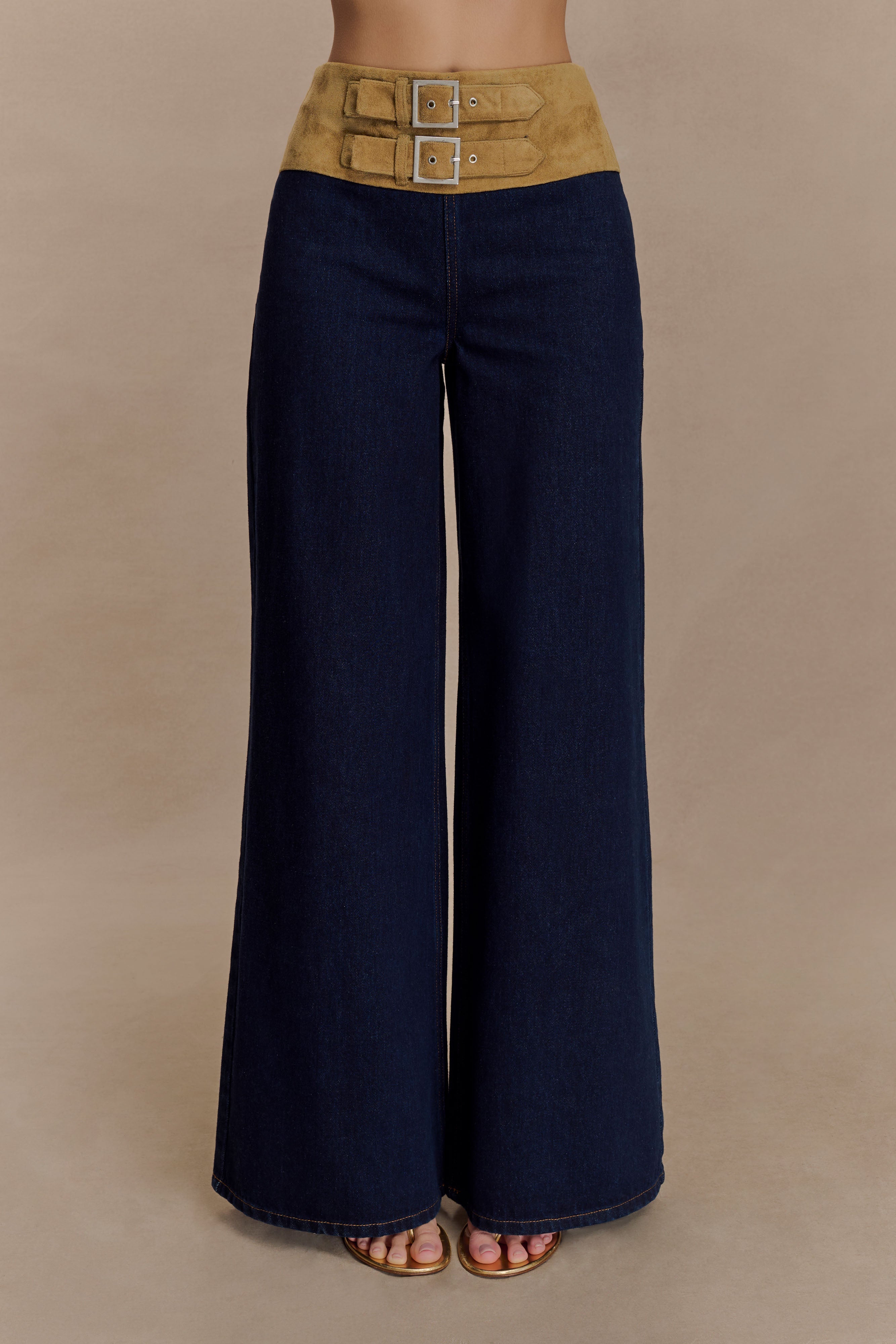 The MIRANDA Suede Belted Denim Wide Leg Jeans bring a bold fusion of texture and tailoring. Featuring a soft suede waist panel with a double buckle front, these mid-rise pants define the waist while offering a relaxed wide-leg silhouette. Finished with a side zip for a clean line, they’re the perfect mix of polished and effortless—ideal for styling from brunch to bold evenings.