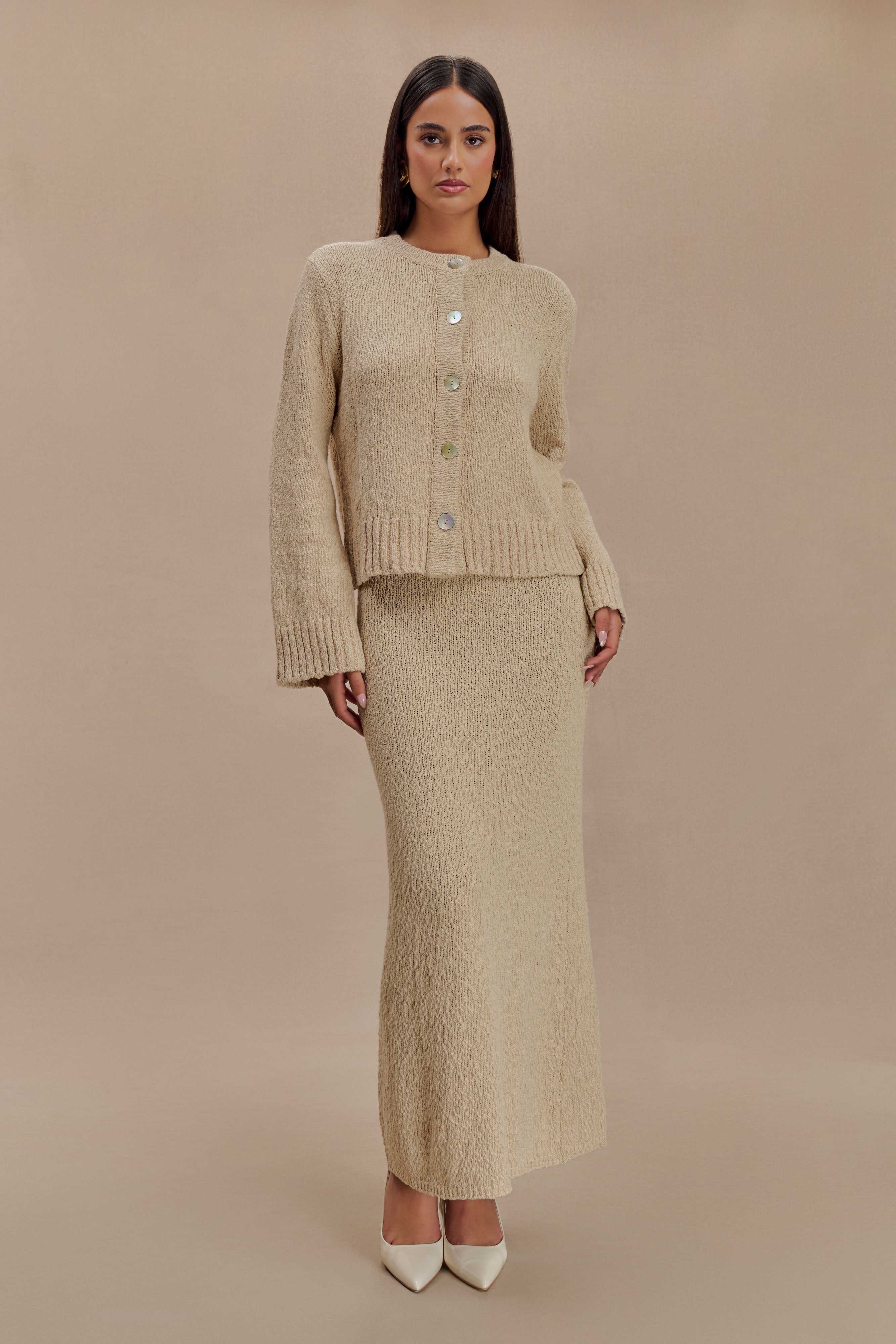 The MOIRA Oversized Boucle Cardigan is the epitome of cozy chic. Featuring a round neckline and drop shoulders, this cardigan offers a relaxed and comfortable fit. The straight sleeves and functional centre front button closure add to its classic appeal. Crafted from soft boucle knit fabric, this oversized cardigan provides warmth and texture, making it a perfect layering piece for any outfit. Whether paired with jeans for a casual look or the Moira Boucle Maxi Skirt for added elegance, the Moira Oversized Boucle Cardigan is a versatile and stylish addition to your wardrobe.Â