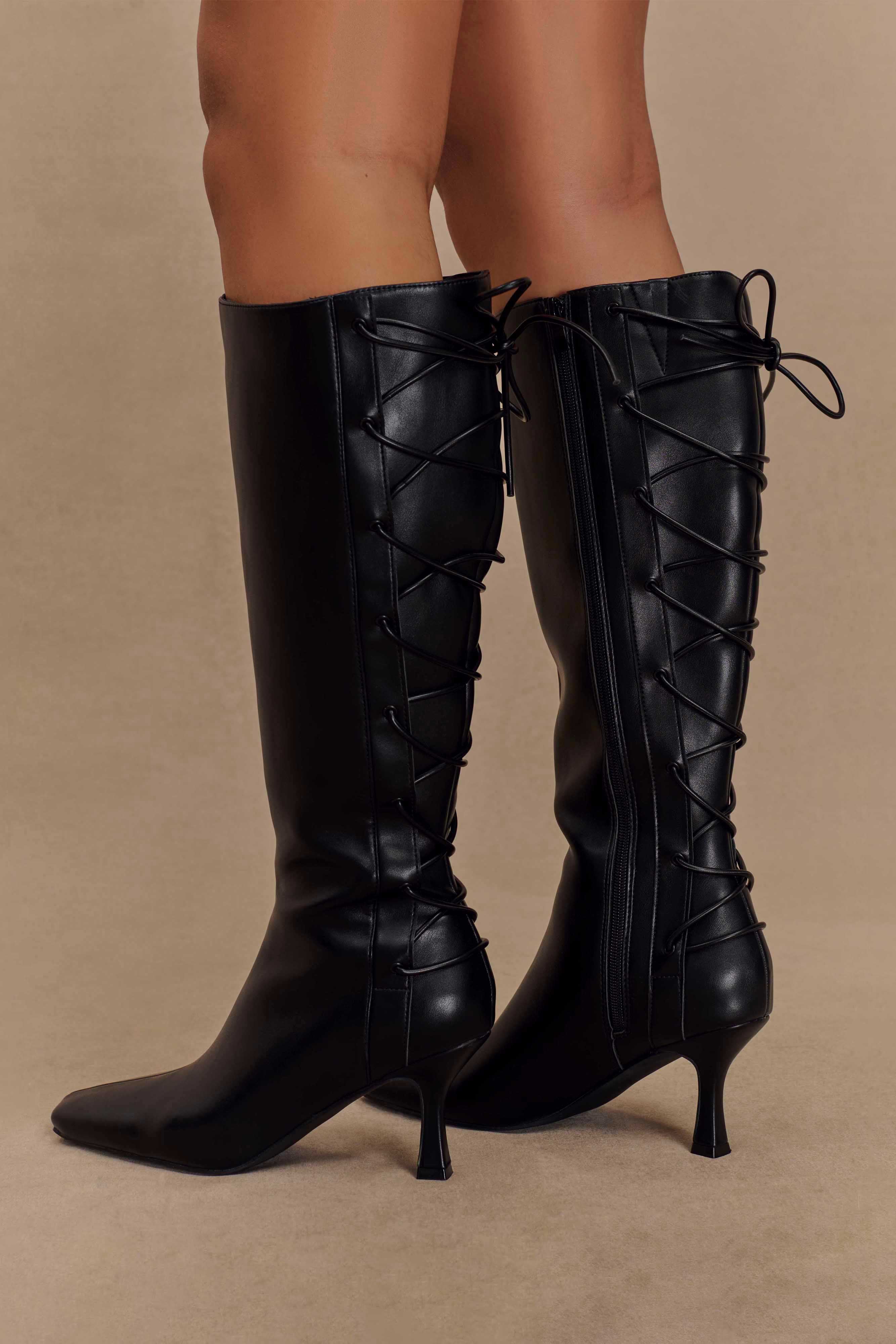Elevate your footwear game with the NEVAEH Lace Up Boots, a perfect fusion of edge and sophistication. Featuring a sleek square toe and a sturdy square heel, these boots offer modern elegance with every step. The lace-up calf detail adds a statement-making touch, while the side leg zip ensures easy wear. Designed to sit just under the knee, this striking silhouette pairs effortlessly with everything from dresses to tailored pants. Whether for a casual day out or a bold evening look, these boots are the ultimate blend of function and fashion.