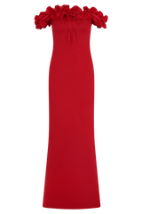 The NOVA Ruffle Off Shoulder Maxi Dress is the epitome of effortless elegance and sultry sophistication. Designed with a statement off-the-shoulder neckline, it features cascading double ruffle layers in chiffon for a bold, feminine touch. The rest of the dress is crafted from thick jersey fabrication, offering a sculpting bodycon fit that contours beautifully to your figure. A fishtail hem enhances the silhouette, creating graceful movement with every step. With its unlined design and timeless maxi length, this dress is the perfect choice for a refined evening look.