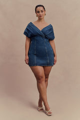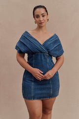 The PASCALE Off Shoulder Denim White Dress brings a fresh take to feminine tailoring. Designed with a Bardot neckline and crossover detail at the front and back, this mini silhouette combines sculptural shape with flattering pleat accents through the bodice. A fitted waist enhances the form, while the mini length keeps it modern and playful. Finished with a back zip for a seamless fit, this dress is your go-to for elevated denim with a romantic twist.