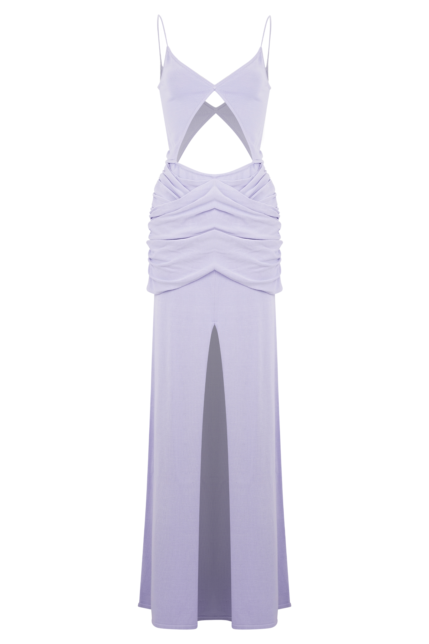 The REAMA Wrap Over Knit Maxi Dress is your elevated go-to for warm city days and romantic evenings alike. Designed with a flattering V neckline and twist front detail, this maxi silhouette features bold front and back waist cutouts that highlight the figure. A gathered overlay panel adds texture and dimension, while a front skirt split creates soft movement with every step. Crafted from a lightweight knit and unlined for a breathable, second-skin feel, this dress effortlessly balances structure and fluidity.