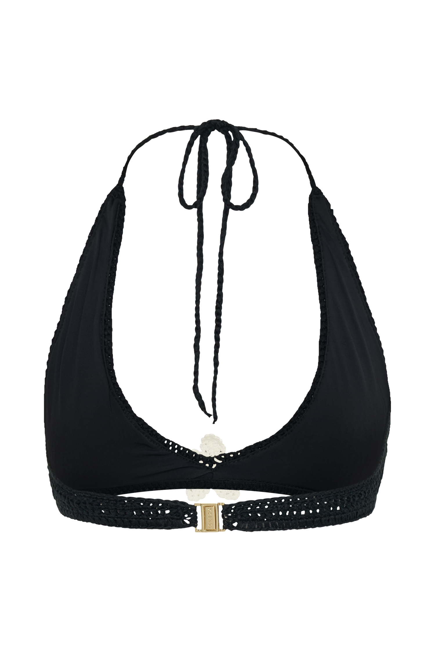 The RHIANNON Floral Crochet Halter Bikini Top exudes a whimsical and chic beachside charm, perfect for sun-soaked days. This bikini top features a functional halter design that provides adjustable support and a comfortable fit. The V neckline enhances its feminine allure, making it a flattering choice for various body types. Crafted from intricate crochet with delicate flower appliqué details, it adds a touch of artisanal beauty to your swimwear collection. The inclusion of a MESHKI golden back clasp not only secures the top in place but also adds a luxurious and stylish accent. Ideal for pairing with your favourite beach cover-up and Skye Floral Crochet Tie Up Bikini Bottom, the Rhiannon top is a stunning piece that combines functionality with fashionable flair.