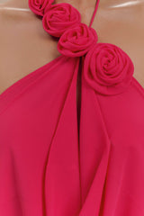 The ROSALIA Cowl Neck Maxi Dress is a captivating blend of elegance and romance. Featuring a deep cowl neckline and an alluring open back, this dress is designed to turn heads. Designed to have a soft draped fit around the neckline and soft fit body, the adjustable halter tie ensures a perfect fit, while the delicate chiffon rose applique detail adds a touch of whimsical charm. With its relaxed, drapey fit and floor-skimming maxi length, this dress is both effortlessly graceful and strikingly sophisticated.