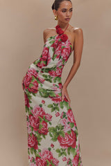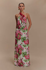 The ROSALIA Cowl Neck Maxi Dress is a captivating blend of elegance and romance. Featuring a deep cowl neckline and an alluring open back, this dress is designed to turn heads. Designed to have a soft draped fit around the neckline and soft fit body, the adjustable halter tie ensures a perfect fit, while the delicate chiffon rose applique detail adds a touch of whimsical charm. With its relaxed, drapey fit and floor-skimming maxi length, this dress is both effortlessly graceful and strikingly sophisticated.