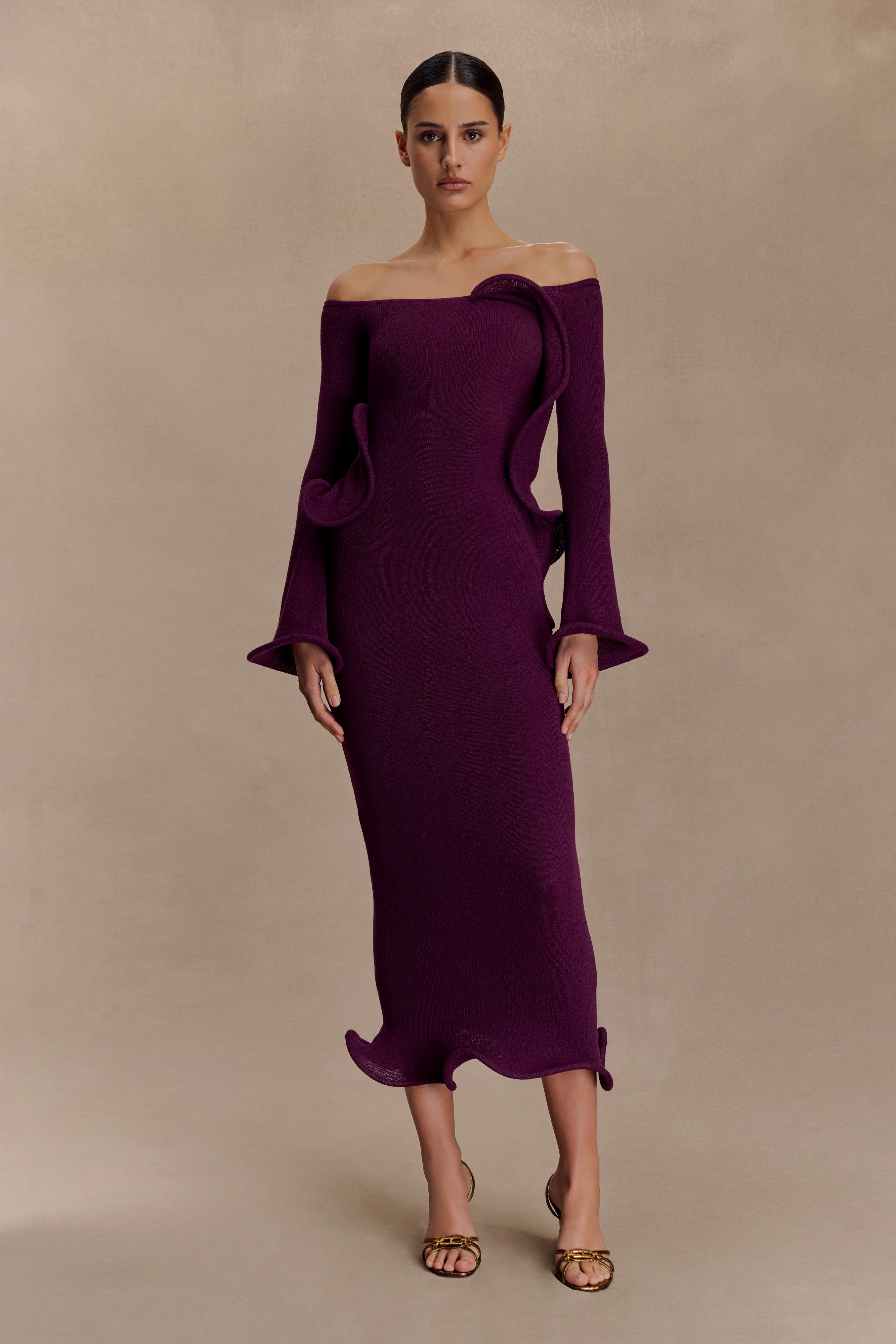 The SANDRINE Off Shoulder Knit Maxi Dress is a striking blend of romance and refinement. Designed with a Bardot neckline and long sleeves, this fitted silhouette features flared sleeve hems and delicate ripple panel detailing through the front. The fishtail hem and softly rippled finish create graceful movement, while the unlined knit fabrication hugs the body in all the right places. this dress is your go-to for elevated evenings, balancing softness with sculptural allure.