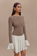 The SANSA Knit and Linen Mini Dress seamlessly blends comfort with style, featuring a crew neckline and a fitted knitted bodice and sleeves that offer a chic and cozy fit. The cotton flared sleeve cuffs and skirt add a touch of playful elegance, creating a flattering, feminine silhouette. With a stretch bodice that eliminates the need for a closure, this dress provides both ease and versatility. Perfect for casual outings or laid-back gatherings, the Sansa Dress combines a relaxed design with refined details for a sophisticated yet comfortable look.