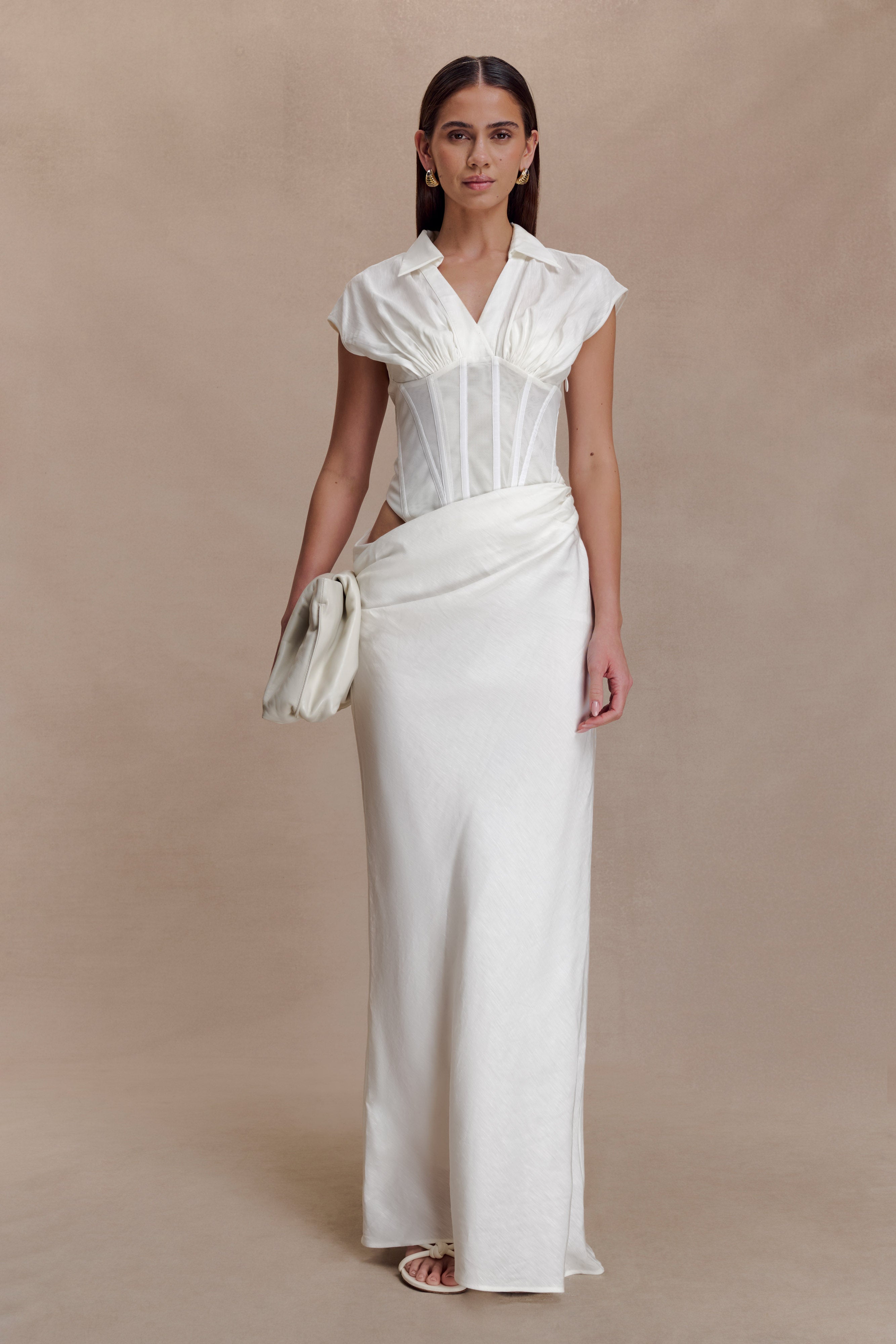 The SAPHIRA Shirt Corset Maxi Dress redefines classic tailoring with a romantic finish. Featuring a V-neckline with a curved seam across the bust, it’s sculpted with a mesh corset and internal boning for a structured, body-defining fit. Gathered detailing through the bust cups adds subtle texture, while the draped asymmetrical skirt falls fluidly to a maxi length. Sleeveless and fitted with a discreet side zip, this dress is a statement in contrast—balancing sharp lines with soft movement.