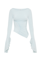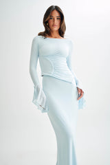 Indulge in sophistication with our STEVIE Bell Sleeve Slinky Top, blending effortless style with timeless design. Featuring a flattering boat neckline and elegant, long flared sleeves, this top is meticulously crafted for those who adore subtle refinement. Its asymmetrical hemline adds a contemporary touch, complementing the front ruched panel detailing that enhances its bodycon silhouette. Fully lined for comfort and confidence, it effortlessly transitions from day to night, making it perfect for any occasion. Discover the irresistible allure of the Stevie Top and effortlessly redefine elegance. Pair with the Bruna Slinky Fishtail Maxi Skirt to complete the look.