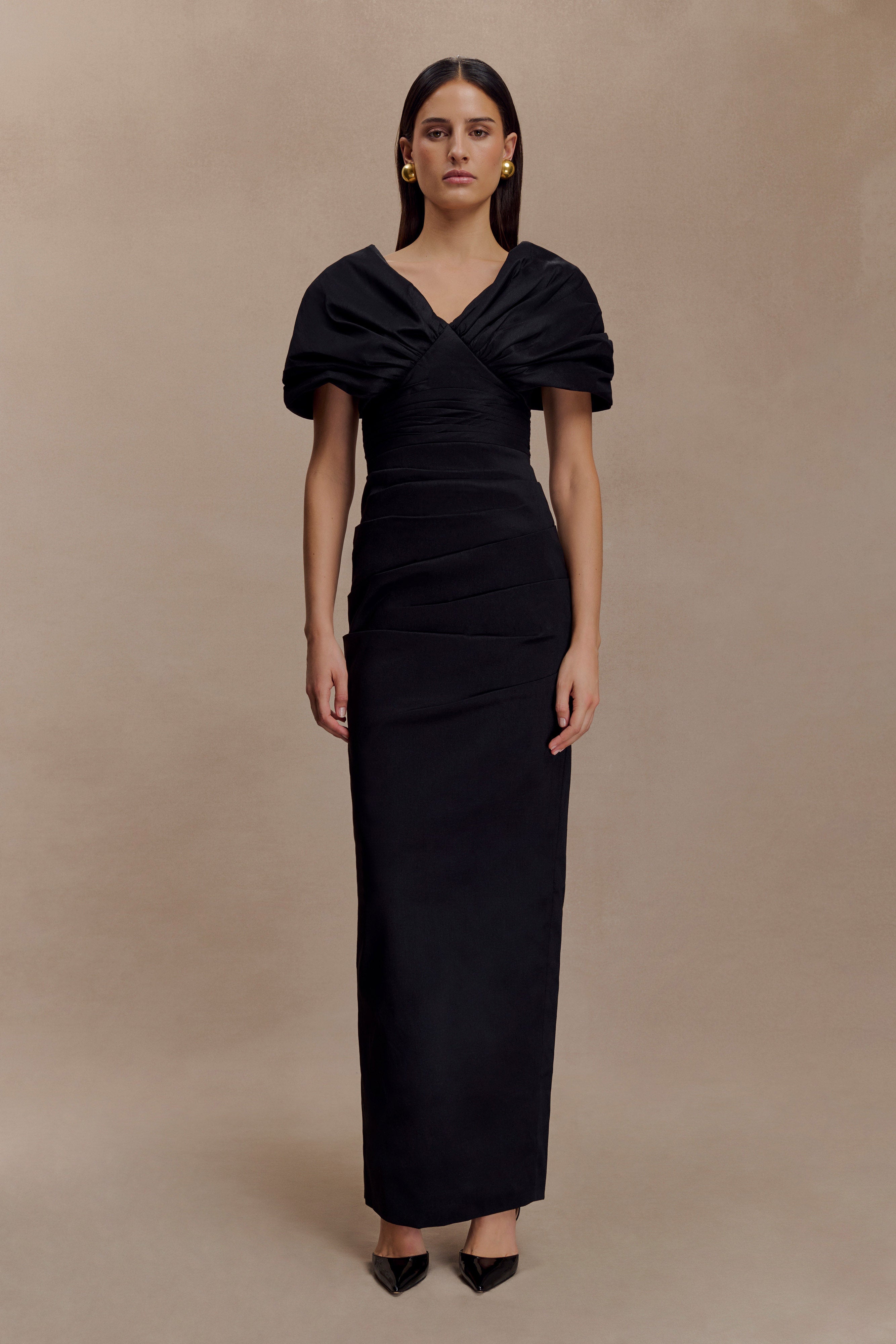 The THELMA Bardot Maxi Dress offers two equally striking ways to wear—gathered sleeves resting delicately on the shoulders for a refined finish, or draped off the shoulders for an alluring Bardot silhouette. Designed with a flattering V-neckline, pleating across the body, and a relaxed pencil-shaped fit, this dress flows to a maxi length for an elongating effect. Internal bust cups, a secure waist stay, and an invisible centre back zip ensure a supportive fit, while internal snaps and a chain loop make its multi-way styling effortless. Fully lined for comfort, this dress is a sophisticated choice for both classic and contemporary moments.