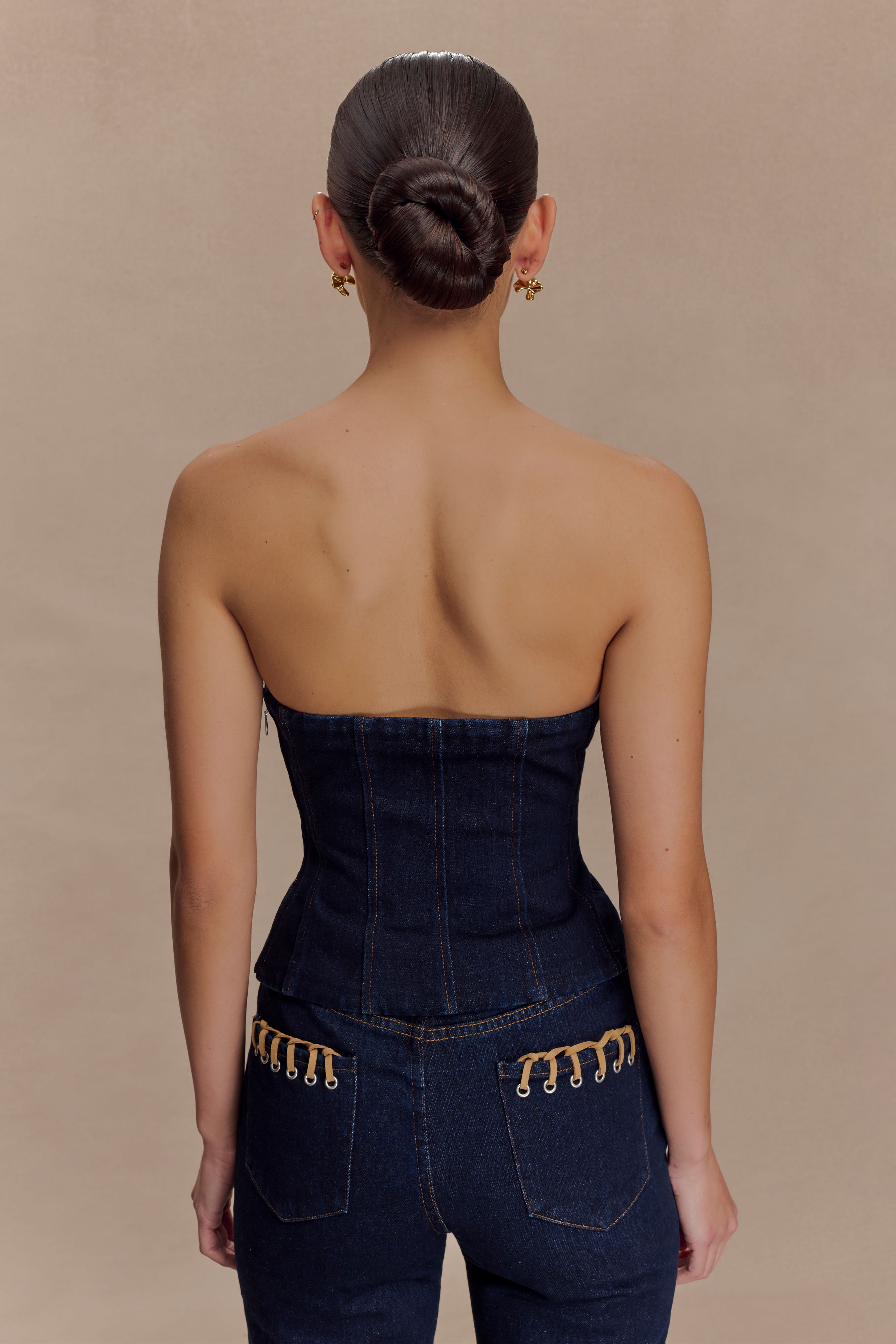 The TULLY Strapless Topstitch Denim Top is your new statement staple—crafted for structure with a sculpted edge. Designed with a flattering princess neckline and curved centre front shaping, this strapless silhouette is lined for comfort and features internal grip tape for added support. Topstitch detailing adds a tailored finish, while the zip and hook & eye closure ensures a secure, seamless fit. Pair it back with denim, tailoring, or a flowing maxi for an elevated day-to-night look.