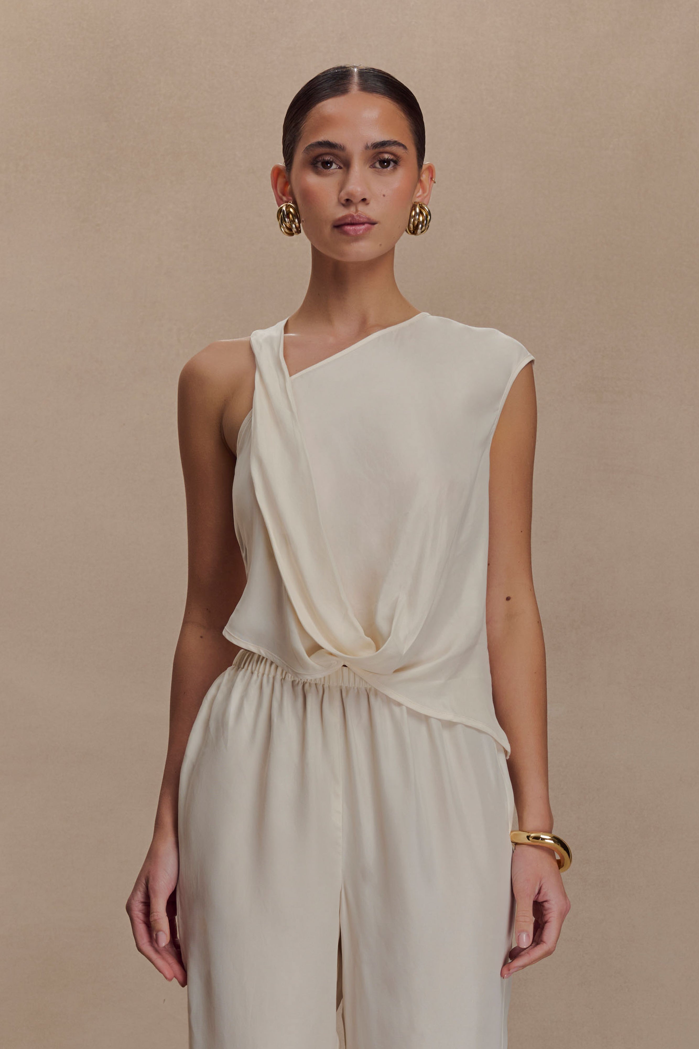 The VIOLETA Asymmetric Top is a fluid expression of contemporary femininity. Designed with an asymmetric neckline and hem, this top brings a sculptural edge to a minimal silhouette. The draped cowl back detail adds graceful movement and unexpected allure, while the invisible side zip ensures a clean, refined fit. Unlined for a lightweight feel, this top pairs effortlessly with tailored trousers or flowing skirts for elevated everyday wear or evenings out.